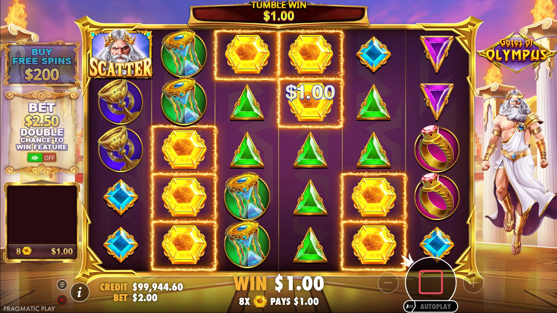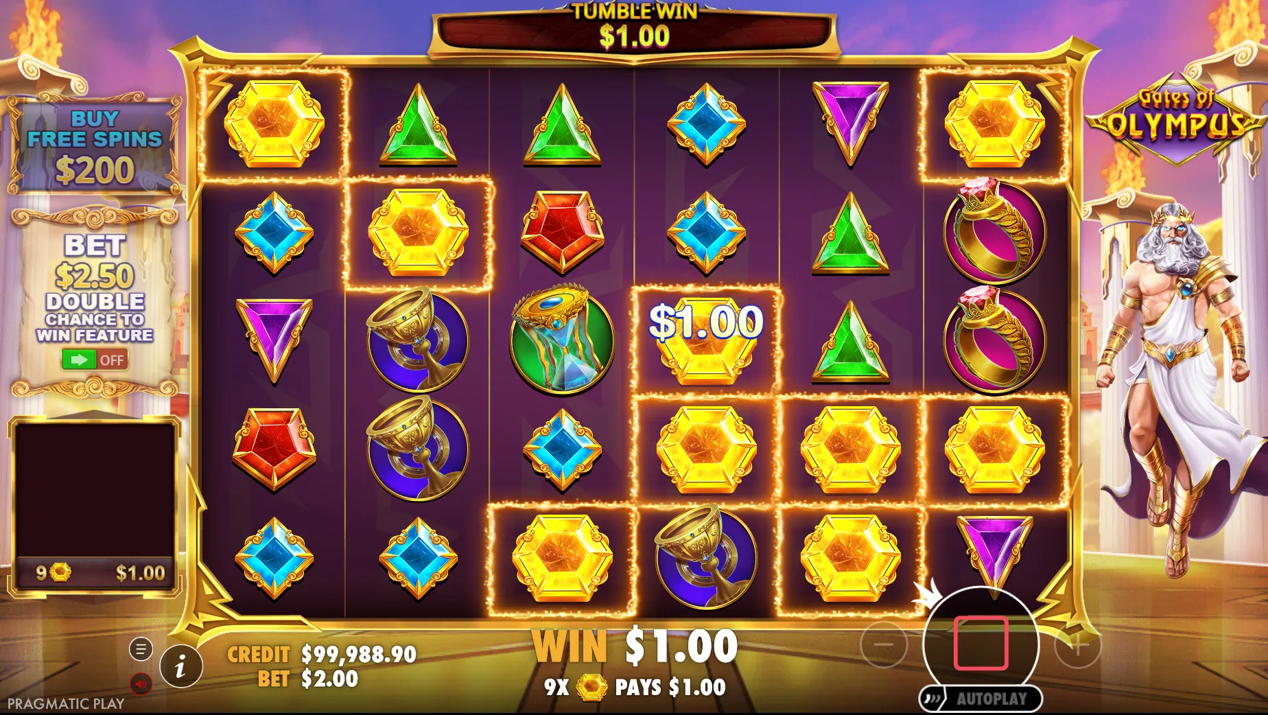 In Gates of Olympus, every symbol works with the Tumble Feature. After a win, the winning symbols disappear and new ones fall down to replace them. This means you can win several times in a row from a single spin. The action is quick, fun, and there are tons of chances to score big.